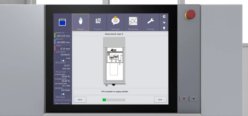 安裝向?qū)箼C(jī)床操作輕而易舉!機(jī)床操作人員可直接通過機(jī)床人機(jī)界面調(diào)用 TruPrint 安裝向?qū)?。隨后,操作人員可以在向?qū)е兄鸩酵瓿筛鱾€工步,例如零層磨合。