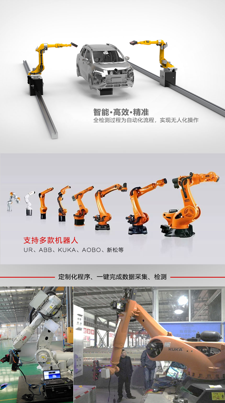 自動化三維掃描系統(tǒng) 該系統(tǒng)具備自主學習路徑掃描,人機協(xié)作,自主規(guī)劃掃描路徑,可定制2D、3D視覺識別,一鍵自動生成機器人程序。 自動化三維掃描系統(tǒng) 機器人三維智能引導系統(tǒng)(RTIG),作為自動化工業(yè)領域的應用設備在今后將會發(fā)揮不可替代的作用。大到汽車產(chǎn)業(yè)的焊接作業(yè)、流水線的分類挑選,小到單個物件的識別抓取等。而三維掃描儀憑借其高速度,高質(zhì)量的數(shù)據(jù)采集能力,在工業(yè)、文化領域都有廣泛的使用,而兩者相結合是機器視覺領域一直在嘗試推進的一項很實際的應用。來高科技(天津)有限公司經(jīng)過多年的研究開發(fā),?將三維掃描儀與機器人結合,實現(xiàn)了全自動數(shù)據(jù)采集和空間任意位置信息的獲取和計算。 技術特點: 支持與機器人進行多種方式交互通訊,可根據(jù)協(xié)議定制開發(fā)。 設備輕量級,根據(jù)機器人負載進行定制。 掃描過程無需標記點,全自動拼接。 全自動掃描,并可根據(jù)需求輸出數(shù)據(jù)。 可根據(jù)實時掃描結果修正機器人工作路線,實現(xiàn)在線編程。 根據(jù)掃描結果與數(shù)模比對,輸出比對誤差,進行修正、加工?、打磨等。 可定制2D、3D視覺識別,一鍵自動生成機器人程序。 機器人智能3D數(shù)字化檢測系統(tǒng),將“一鍵式掃描”、“全尺寸檢測”、“人機協(xié)作”、“自動檢測報告”、“自主學習”等優(yōu)勢完美融合。配合高像素、快速掃描的產(chǎn)品性能優(yōu)勢,可以快速獲取三維數(shù)據(jù)。該系統(tǒng)具備自主學習路徑掃描,人機協(xié)作,自主規(guī)劃掃描路徑,可定制2D、3D視覺識別,一鍵自動生成機器人程序。? 技術特點: ? ? ??? 掃描過程無需標記點,全自動拼接。 ? ? ????全自動掃描,并可根據(jù)需求輸出數(shù)據(jù)。 ? ? ????根據(jù)掃描結果與數(shù)模比對,輸出比對誤差。 ? ? ????可定制2D、3D視覺識別,一鍵自動生成機器人程序。 ? ? ????應用于工業(yè)自動化流水線的快速檢測。 更多詳情請點擊——自動化三維掃描系統(tǒng) 上頁 下頁